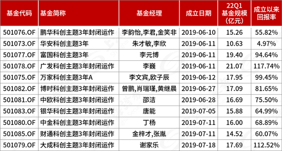 2019年6月至7月,首批11只科创主题3年封闭基金陆续成立,目前这批封闭基金正在陆续开放中。