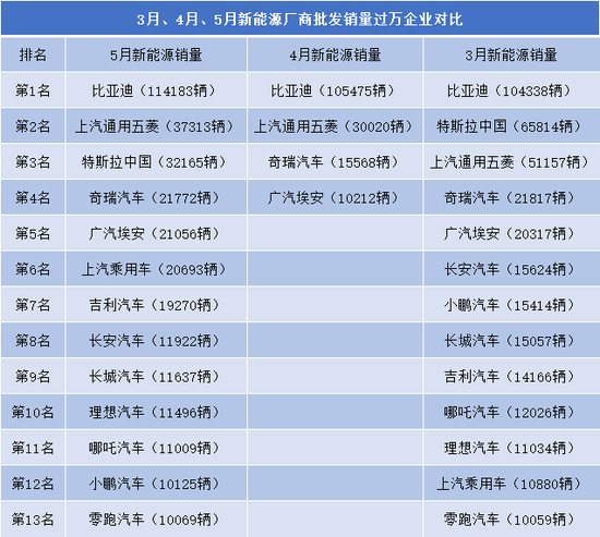 乘联会数据显示,5月新能源品牌月销量过万的有13家车企,与3月过万车企数量持平,较4月的4家多出了9家。其中特斯拉中国、上汽乘用、吉利汽车、长安汽车等老牌车企以及理想、哪吒等造车新势力均重回万辆。