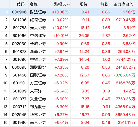 6月14日,证券板块大涨5.56%,财达证券、红塔证券、光大证券(维权)、中信建投、长城证券涨停;浙商证券大涨近8%;中银证券上涨7.39%;第一创业上涨5.2%;中金公司上涨5%。