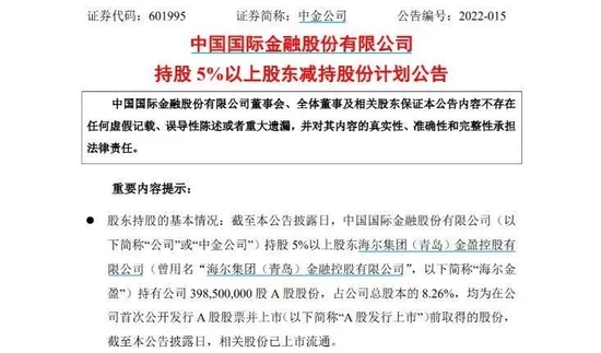中金公司表示,公司收到持股5%以上股东海尔集团(青岛)金盈控股有限公司(以下简称“海尔金盈”)出具的《关于中金公司股票减持计划的通知》。