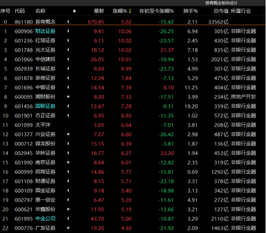 令人惊喜的是,6月14日,个别券商股早盘表现亮眼,但盘中伴随着大盘大跌“难以发力”,好在之后大盘午后反弹,券商股尾盘更是出现猛烈拉升,券商概念指数今日涨幅超过5%。券商概念板块个股集体飘红,其中39只券商概念股涨幅超过4%。而财达证券、红塔证券、光大证券(维权)、中信建投、长城证券更是涨停。