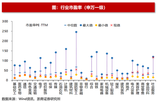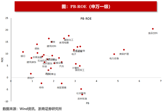 从PB-ROE的角度来看,目前估值水平远低于盈利能力的行业分别为银行、钢铁、煤炭、建筑装饰、非银金融、建筑材料、家用电器、基础化工、交通运输、轻工制造。