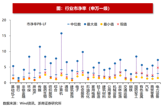 上周市净率分位数(十年)较低的行业有基础化工 (0%)、银行 (1%)、非银金融 (1.2%)、环保 (2.2%)、房地产 (2.8%),市净率分位数(十年)较高的行业有电力设备 (88.4%)、商贸零售 (71%)、汽车 (62.9%)、有色金属 (60.1%)、国防军工 (56.5%)。