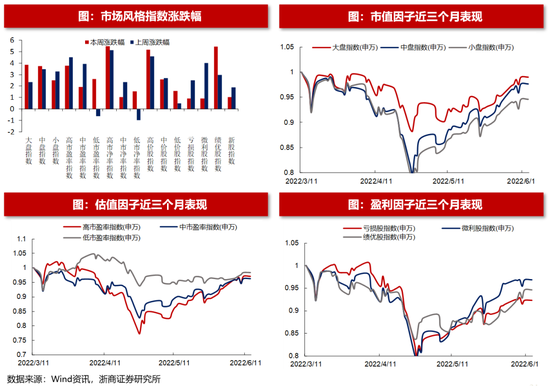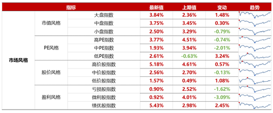 上周大盘指数、高PE指数、高价股指数、绩优股指数表现相对占优。上周市值风格中,大盘/中盘/小盘指数涨跌幅分别为3.84%、3.75%、2.5%。PE风格中,高PE/中PE/低PE指数涨跌幅分别为3.77%、1.93%、2.61%。股价风格中,高价股/中价股/低价股指数的涨跌幅分别为5.18%、2.56%、1.57%。盈利风格中,亏损股/微利股/绩优股指数的涨跌幅分别为0.9%、0.92%、5.43%。