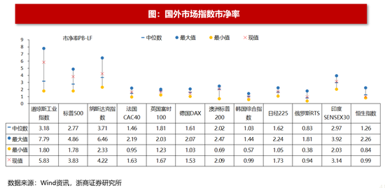 上周道琼斯工业指数、标普500、纳斯达克指数、法国CAC40、英国富时100、德国DAX、澳洲标普200、韩国综合指数、日经225、俄罗斯RTS、印度SENSEX30、恒生指数的市净率分别为5.83、3.83、4.22、1.63、1.53、2.09、0.99、0.99、1.73、0.94、3.14、0.99。过去十年分位数分别为83.7%、84.9%、61%、74.9%、19.8%、25.2%、62.6%、43.1%、62.8%、70.9%、71.8%、9.9%。