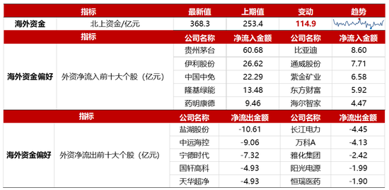 上周北上资金净流入。上周北上资金净流入368.3亿元,较前一周流入增加114.9亿元。