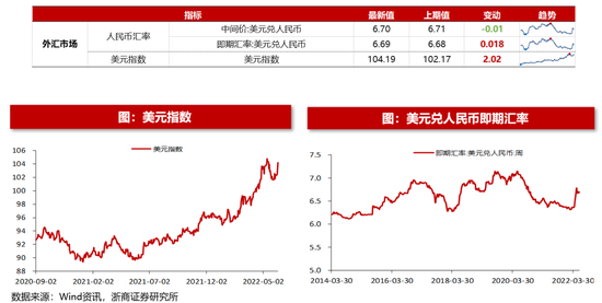 上周美元指数上升,人民币对美元升值。上周美元指数为104.19(+2)。美元兑人民币即期汇率为6.69(+0.018)。