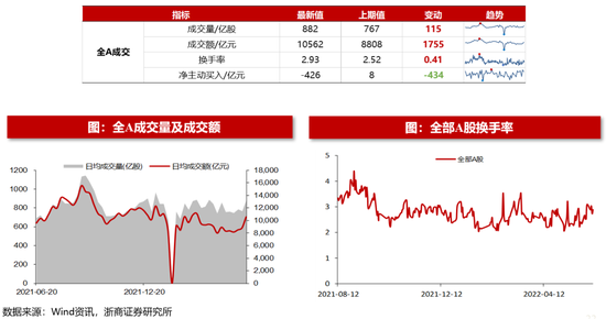 上周全A日均成交额增加。上周全A日均成交量为881.9亿股(+115.4亿股),成交额为10562.3亿元(+1754.7亿元)。