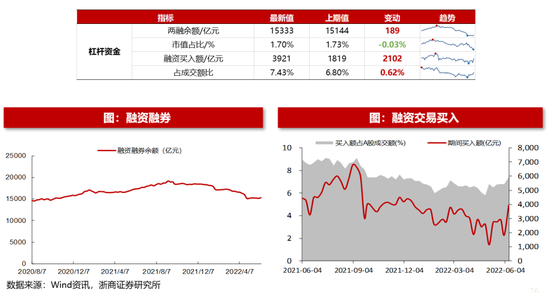 上周两融余额上升。上周杠杆资金两融余额为15332.9亿元(+189.2亿元),市值占比为1.7%(-0.03%)。融资买入额3920.5亿元(+2101.6亿元),占成交额比重为7.4%(+0.6%)。