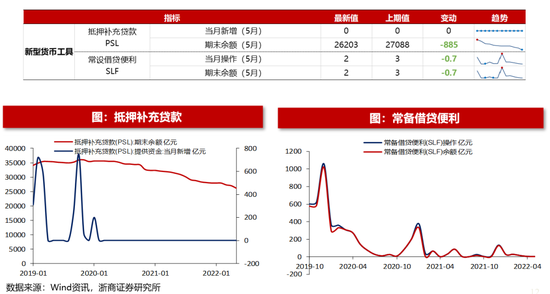 5月PSL新增0亿元。5月PSL期末余额为26203亿元,当月减少885亿元。