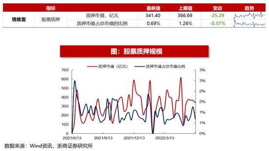 上周股票质押占总市值的比例下降。上周质押市值为341.4亿元(-25.29亿元),质押市值占总市值的比例为0.69%(-0.57%)。