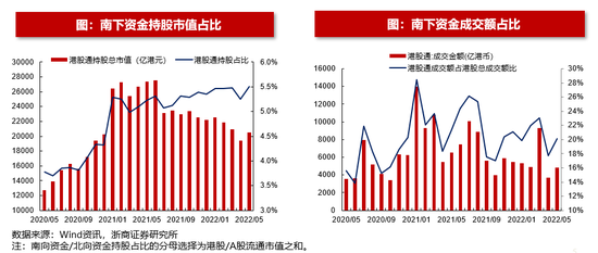 南下资金持股和交易占比扩大,对港股的影响力逐渐增强。港股通持股市值占流通市值的比例从2020年5月的3.8%上升至2022年5月的5.5%,持股比例不断扩大。而成交额方面,港股通成交额占港股总成交额的比例维持在20%左右。
