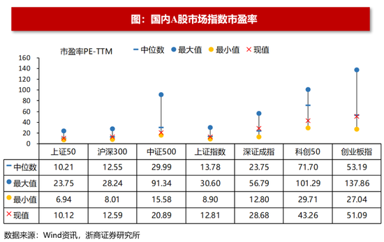 上周上证50、沪深300、中证500、上证指数、深圳成指、中小板指、创业板指的市盈率分别为10.12、12.59、20.89、12.81、28.68、43.26、51.09。过去十年分位数分别为55.1%、57.3%、11.2%、42.2%、68.4%、10.1%、46%。