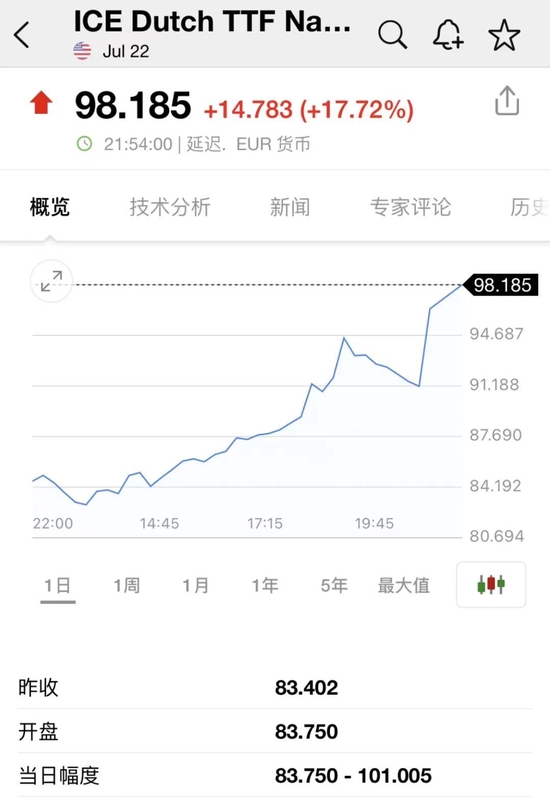 受此消息影响,欧洲天然气价格大涨。英为财情数据显示,截至发稿,荷兰TTF基准天然气即月期货价大涨17.72%,报98.185欧元/兆瓦时。