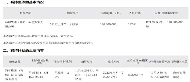 券商股行情火热,部分股东套现迎来时机。6月13日晚间,中金公司公告显示,公司持股5%以上股东海尔集团(青岛)金盈控股有限公司(曾用名“海尔集团(青岛)金融控股有限公司”,以下简称“海尔金盈”)计划自此次公告披露之日起3个交易日结束后的6个月内,通过大宗交易方式减持不超过1.35亿股A股股份,减持部分不超过公司总股本的2.8%。