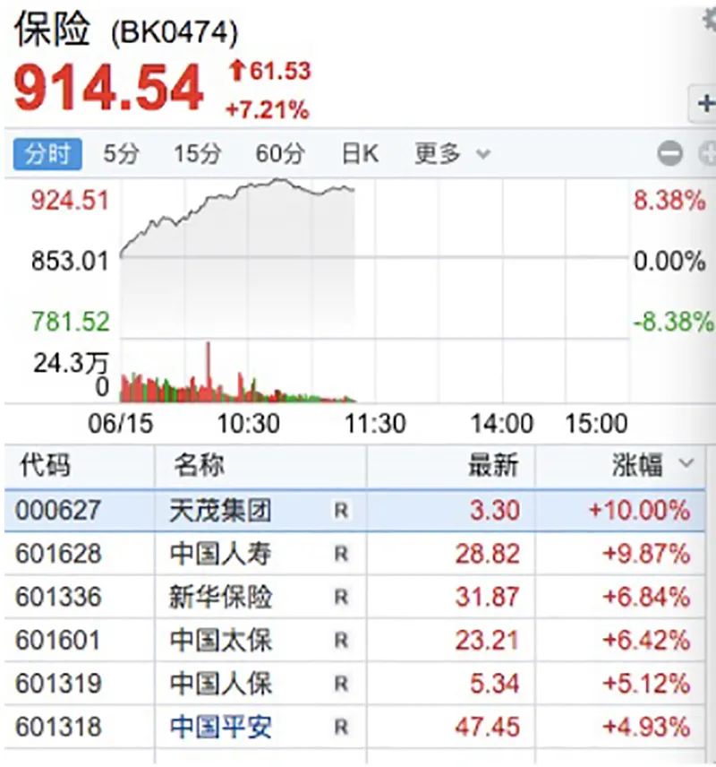 保险板块同样大涨,天茂集团涨停,中国人寿冲板,中国人保、新华保险、中国太保、中国平安等纷纷上扬。