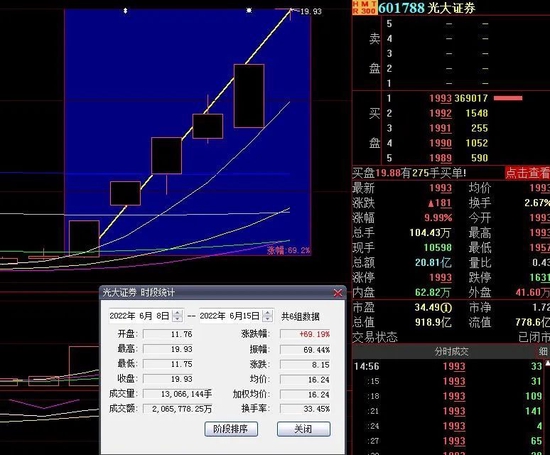6月15日,热门股光大证券再度涨停,截至收盘,报19.93元,总市值达918.9亿元,实现六天五板,期间累计涨达69.19%。