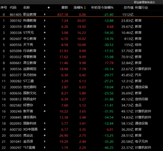 今日,职业教育概念表现亮眼,板块涨幅超过6%,年内跌幅缩小至21.4%。