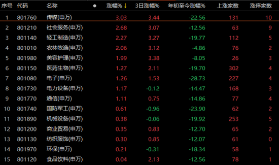 社会服务、轻工制造、农林牧渔板块涨幅均超过2%。美容护理、医药生物涨幅超过1%,电子、电力设备、通信、国防军工、机械设备等近期反弹较大的板块,今日表现也不错。
