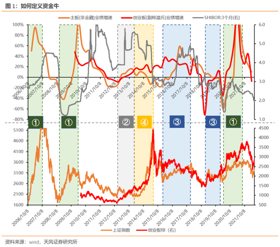 4)市场走势与当期业绩背离,但在极为宽裕的流动性推动下大幅上涨:最典型的阶段就是14Q3-15Q2。需要区分的是,当时创业板业绩温和改善,但由于有外延并购增厚业绩的预期,市场一定程度上仍是对基本面下注,15年股灾后也证实了创业板业绩的持续改善,直至17年商誉暴雷。而主板业绩从14年起持续下行,直到16年才触底回升,因此14年下半年开始的持续一年的主板牛市,是真正完全由资金面推动的牛市,即我们定义的“资金牛”。