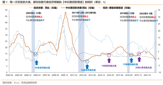 而中长期贷款增速反转和市场反转则往往是同步指标,例如05年末、12年末、16年初、19年初、20年3月。这是因为,中长期贷款余额中企业占六成,居民部门占四成,能够更真实地反映实体部门(制造业、地产)的融资需求,改善基本面修复预期。因此,中长期贷款的拐点及修复力度,才是中期市场的决定性因素。