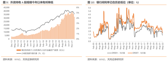 4)17年外资加速流入之后,需要更多地考虑海外流动性环境。目前来看,海外通胀数据超预期+美联储缩表回收流动性、美债利率水平高位运行。叠加国内环境,当国内疫情快速好转,同时海外回收流动性、人民币汇率贬值压力提升,则国内货币政策的空间也会逐步压缩,进而国内利率水平触底回升。因此当前银行间流动性极为充裕的状态可能也并不具备持续性。