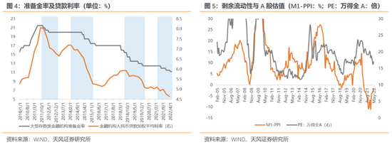 换言之,银行间流动性宽裕≠股市增量资金,只有当非金融企业和个人形成了融资需求,在满足了生产和消费之后有剩余,这部分钱才能在监管允许范围内进入股市——这也是“剩余流动性”的含义所在。历史数据也表明,以M1-PPI衡量的剩余流动性的确与市场估值有着较高的关联度。