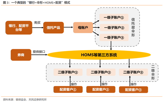 银行理财还可以借助通道参与配资业务,伞形信托就是当时很典型的一种模式,即理财产品购买信托产品,接入HOMS系统后将子账户进一步拆分给配资客户操作。