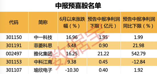 数据宝统计,中一科技、菲菱科思、雅化集团、中科江南、瑜欣电子已经发布半年报业绩预告,按预告下限看,雅化集团预增超5倍,菲菱科思预增21%,中一科技、瑜欣电子微增。