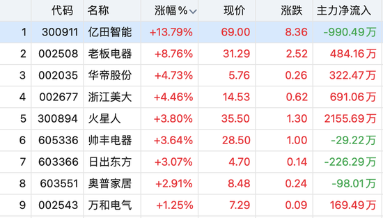 厨卫电器全天领涨,板块内个股全部飘红,亿田智能大涨超13%。
