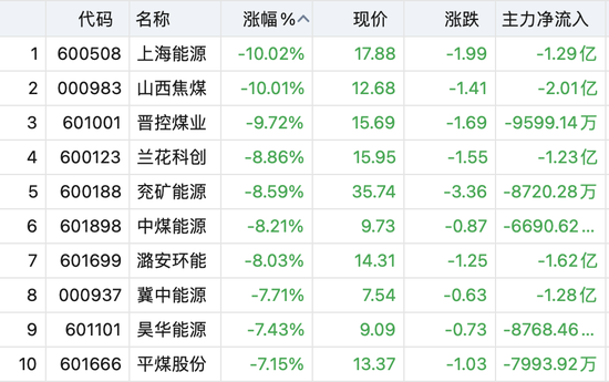 A股煤炭开采加工板块全天领跌,上海能源、山西焦煤双双跌停。