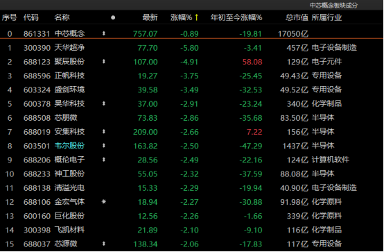 中芯概念跌幅近1%,中芯国际收跌1.14%报45.16元/股,年内跌幅仍近15%。汽车芯片概念股韦尔股份今日下跌2.5%报163.82元/股。
