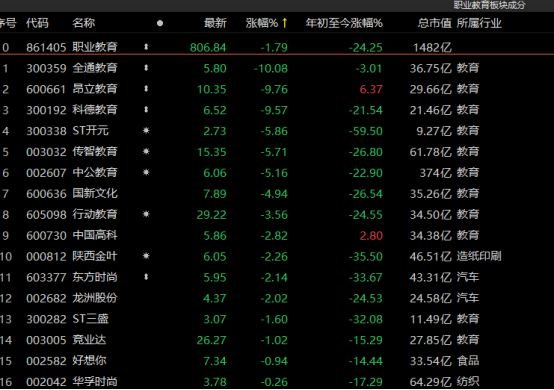 职业教育降温,近期大涨的全通教育今日跌幅超过10%,昂立教育、科德教育跌幅超过9%。