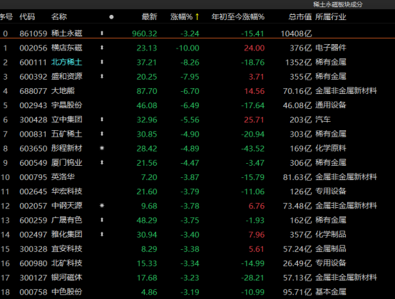 稀土永磁概念板块领跌,近期猛涨的横店东磁今日低开低走,最后跌停,全天成交额超过27亿元。不过,4月17日至今期间涨幅仍约78%。