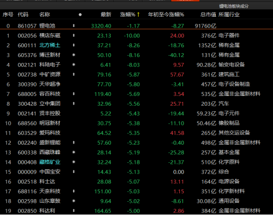 锂电池概念股也低迷,19只相关个股跌幅超过5%。比亚迪、亿纬锂能、广汽集团等市值较大的个股最后收跌。