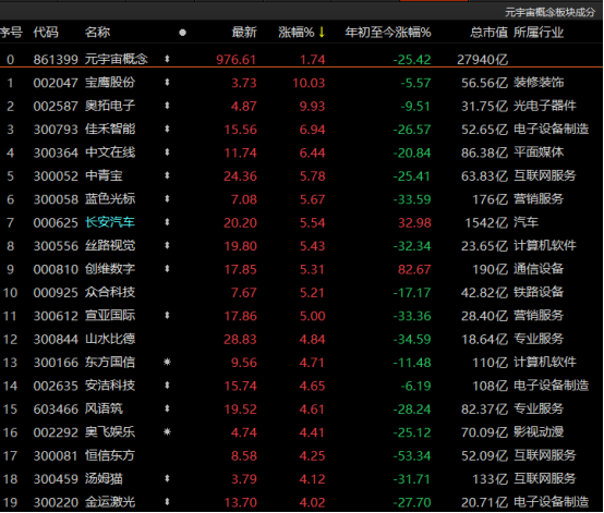 元宇宙概念涨近2%,宝鹰股份、奥拓电子涨停,佳禾智能、中文在线等大涨。
