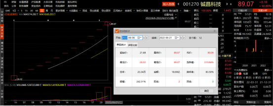 伴随着近期A股的反弹,新股表现亮眼,除去观典防务,31只个股均有一定涨幅,这意味着打新者目前仍为浮盈状态。6月6日在深交所上市的铖昌科技首日上市44%涨停,走出12连板,首发价格为21.68元/股,最新收盘价为89.07元/股,今日换手率高达44.62%,日成交额近11亿元。