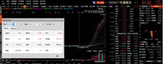 备受市场关注的个股中通客车,今日收涨2.11%报21.32元/股。记者统计发现,4月27日该公司股价一度探底3.85元/股,之后开始酝酿大涨模式,至今的31个交易日累计涨幅近432%。