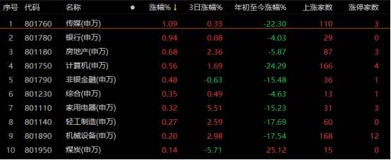 银行、非银金融板块上涨,招商银行收涨1.59%报40.33元/股,中国人寿涨逾4%报30.1元/股,中信证券收涨1.4%报21.01元/股。