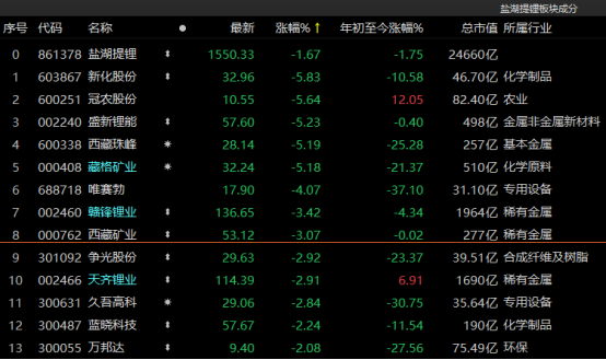 盐湖提锂概念股回调,新华股份、藏格矿业等相关个股跌幅超过5%,赣锋锂业、天齐锂业跌幅约3%。