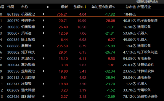 机器视觉概念板块涨幅超过4%,4月27日以来该板块反弹近41%。神思电子以19.99%涨停,年内涨幅超过28%。