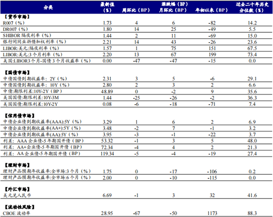 海外内风险偏好均趋于回升。货币市场方面,本周(6.20-6.24)国内利率走势集体上行,R007与DR007较上周分别上行4和14个BP,但仍处于较低水平,表明银行间流动性仍较为宽松;海外市场3个月美元LIBOR利率本周(6.20-6.24)延续上行趋势,但涨幅有所回落,当前美联储处于加息和缩表的紧缩周期,海外流动性继续收紧。债券市场方面,本周(6.20-6.24)短期国债利率和长期国债利率较前一周有所上升,信用债利率趋于下行;10Y与2Y国债期限利差与前一周持平,信用债利差集体收窄,表现市场风险偏好有所回升。汇率方面,美元兑人民币汇率本周(6.20-6.24)略微下行1BP,继续维持企稳状态。流动性风险方面,CBOE波动率(VIX)本周(6.20-6.24)转为回落(-67BP),海外市场风险偏好有所回升。