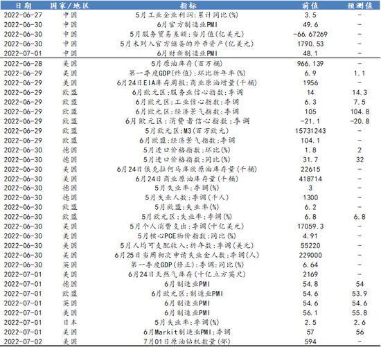 大宗商品方面,本周(6.20-6.24)大宗商品悉数下跌,大豆(-16.8%)、玉米(-16.4%)、铁矿石(-12.2%)、天然气(-10.6%)等领跌,波罗的海干散货指数也由涨转跌(-8.7%)。领跌商品的主要原因:(1)大豆、玉米,经济衰退预期对需求造成冲击,加之美国天气情况改善提振供给;(2)铁矿石,钢厂利润承压、高炉检修叠加进口铁矿石价格影响;(3)天然气:本周公布的EIA天然气库存高于预期,叠加经济衰退预期令需求承压。