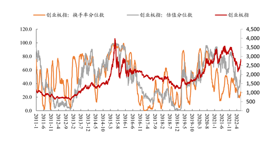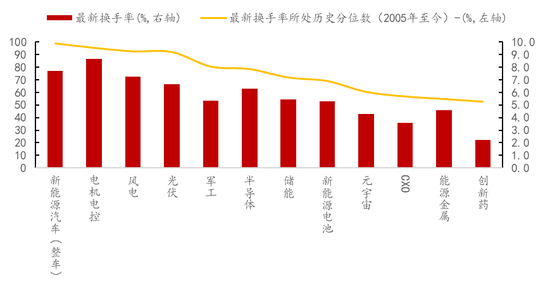 本轮“阶段性反弹”从2022年4月27日至今,A股配置机会上演绎着“疫情后时代,供给端的集中释放”,结构性行情凸显。详情参考我们此前报告《A股上涨动力依然强劲,聚焦“供给”集中释放的机会》——这意味着,热门行业包括:新能源汽车、半导体、光伏、储能、风电、军工等成交量必然会急速放大,而相比A股市场整体成交量上升不多的情况下,往往会导致采用成交量拟合的“交易拥挤度指标”出现失真。因此,我们偏向采用“换手率”去衡量热门板块的拥挤程度。