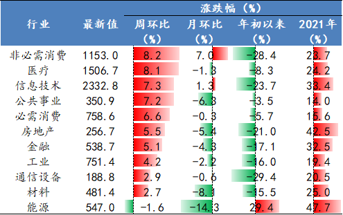 行业方面,本周(6.20-6.24)一级行业多数上涨。其中,电力设备(8.0%)、汽车(5.8%)、家用电器(5.5%)、国防军工(5.0%)、机械设备(4.1%)领涨;煤炭(-6.0%)、石油石化(-5.0%)、有色金属(-2.6%)、建筑装饰(-0.9%)、基础化工(-0.8%)领跌。领涨行业的主要原因:(1)电力设备,其中风电、光伏领涨,因新能源发电设备需求旺盛,加之上游有色金属价格下跌;(2)汽车和家用电器,作为稳定经济的一揽子政策中刺激消费的两大主力,政策刺激叠加复工刺激产销;(3)国防军工,国际环境不确定性加深,国防军工迎快速发展期。领跌行业的主要原因:(1)煤炭、石油石化、有色金属,本周大宗商品全线承压,有色、煤炭、原油价格悉数大幅下挫。