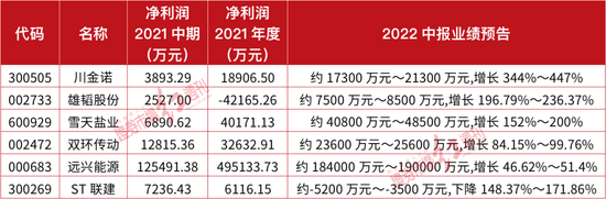 另外,观察发现,雄韬股份在去年年度亏损后今年成功扭亏为盈。同时,随着上半年业绩的快速增长,与去年相比,川金诺、雪天盐业的半年度利润已经接近去年全年的利润。川金诺2021年度归属母公司股东的净利润额为1.89亿元,预告显示今年上半年的净利润额预计约为1.73亿元~2.13亿元,如果以预期上限考虑,今年上半年的盈利额很可能会超越去年全年。雪天盐业2021年度净利润额为4.02亿元,最新中期业绩预告给出的利润额为4.08亿元~4.85亿元,预期利润上限已十分接近去年全年盈利额了。
