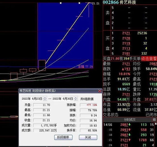 6月30日,热门股传艺科技再度涨停,截至收盘,报21.21元,连续6个交易日涨停,期间累计涨达77.19%。