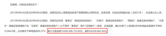 具体来看,当事人刘某是70后,住上海市长宁区。2013年9月24日至2020年6月3日期间,刘某先后任上海海通证券资产管理有限公司研究员、投资经理、权益投资部副总监(主持工作),为证券从业人员。