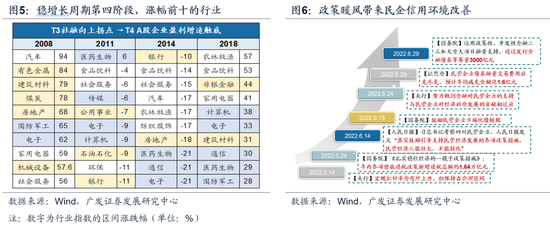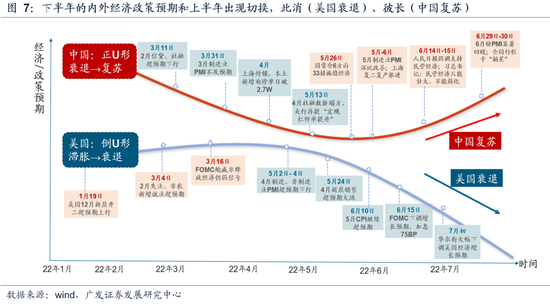 (三)“此消彼长,水到渠成”行情或有波折但不改震荡上行趋势。短期看可能对行情形成扰动的因素:(1)预计在22中报形成的盈利底是在疫情干扰下的表观盈利底,以A股盈利下行周期一般为7-12个季度的规律来看,实际盈利底最快也要到22Q4才会出现,盈利预期或有反复;(2)当前海外“政策底”还未形成,我们判断22H2美联储实质性的紧缩节奏放缓需待22年9月后,下半年仍有波动,不过影响权重已较年初有所下降。(3)我们在6.5《本轮疫后复苏线索与20年有何不同?》中指出,22H2出口动能衰减或快于市场预期,基建、出口难显著超预期,中国经济是否能超预期取决于地产是否进一步放松,基本面确认或有坎坷。但同时我们重申中期A股核心矛盾在于中美“此消彼长”:美国经济形态“倒U型”,从上半年的滞胀→下半年的衰退担忧,中国经济形态则呈现“正U型”,从疫情时期的衰退→疫后复苏。伴随中国政策信心扭转,贴现率驱动先行、业绩确认跟进,政策暖风下中国优势资产的独立行情仍将继续。