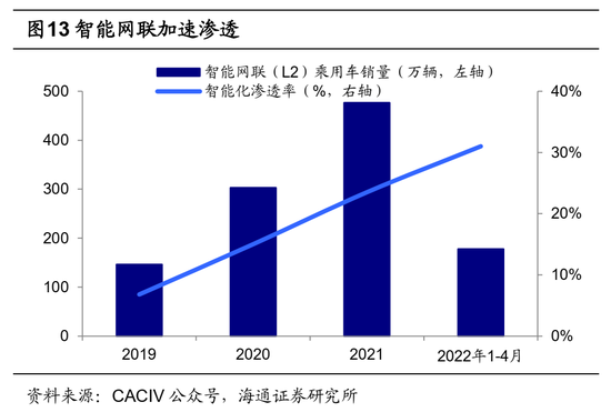 汽车行业电动化智能化趋势明确。电动化方面,新能源汽车渗透率不断提升,市场下沉趋势明显。“双碳”目标下汽车电动化是行业发展的必然选择,《2030年前碳达峰行动方案》明确提出,到 2030 年新增新能源、清洁能源动力的交通工具比例达到 40%左右。21年全年新能源车渗透率为13.4%,今年3月以来,新能源渗透率首次突破20%,电动化趋势不断加速。此外,随着政策支持充电等基础设施的完善,新能源车在三四线城市快速下沉发展。2021年新能源汽车下乡车型累计销售量为106.8万辆,同比增长169.2%,比整体市场增速高约10个百分点,贡献率近30%。